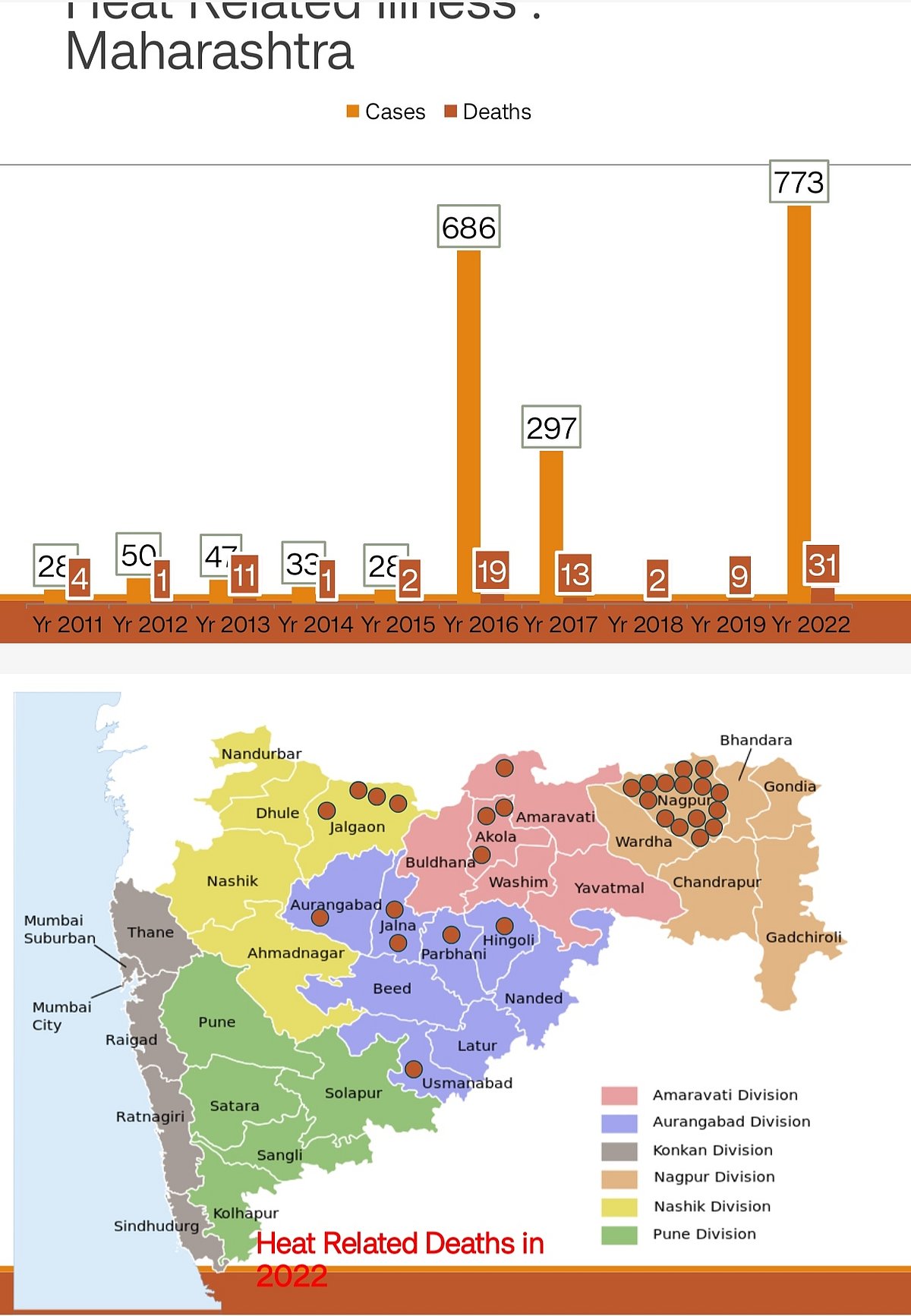 In Maharashtra, there has been a sharp rise in heat-related illnesses and deaths. In 2011, the heat-related illness cases were 28, which sharply rose to 773 in 2020. While the deaths due to heat-related causes were four in 2011, which rose to 31 in 2020. The regions where maximum heat-related deaths are recorded in the state are from Marathwada, Vidarbha, and North Maharashtra.