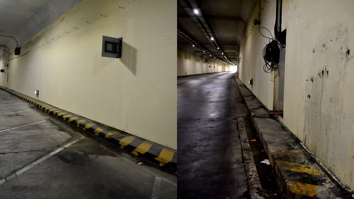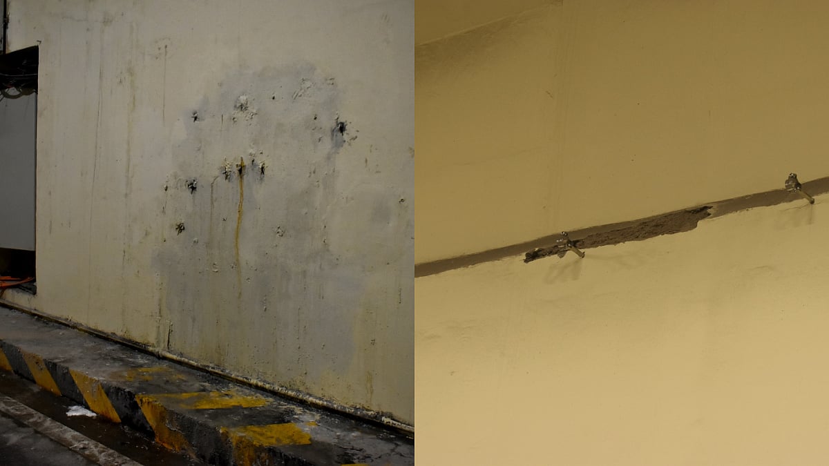 Since Sunday morning, water has been seen dripping from the tunnel roofs, with several dark areas on the walls where paint has chipped off due to humidity. Drip lines extended from these dark patches to the floor, and the edges of the holes were visibly damp. Water had pooled on the coastal road near the Marine Drive end of the tunnel, approximately 100 meters from its exit.
