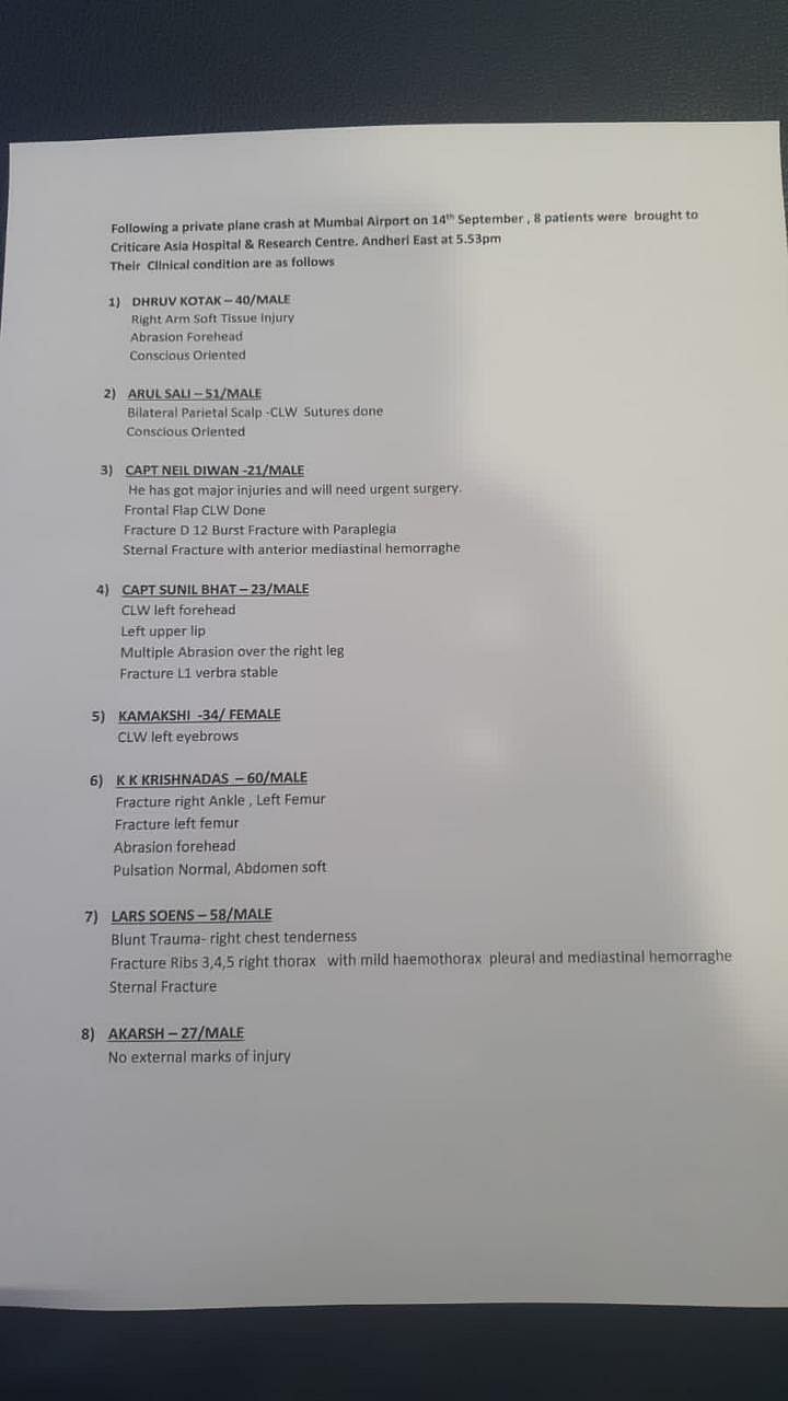 All passengers have been admitted to Criticare Hospital in Andheri East. Co-pilot Neil Diwan is the only one who has sustained major injuries and will require urgent surgery.