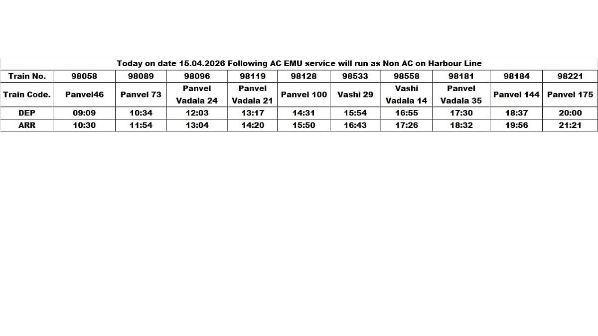Mumbai: Central Railway has announced that several AC EMU services on the Harbour Line will operate as non-AC local trains today, April 15. According to railway officials, a total of seven AC EMU services between CSMT, Panvel, Vashi and Wadala will run as non-AC trains.
