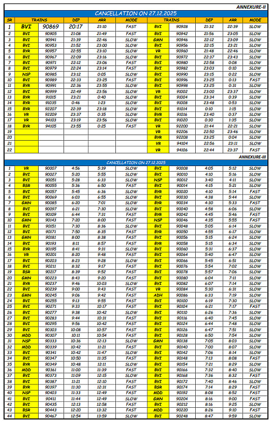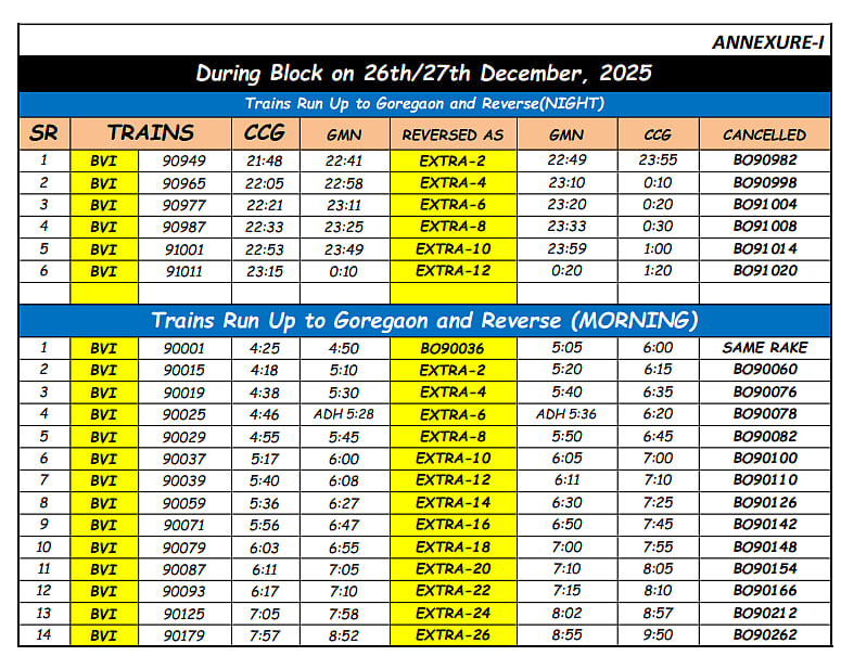 Mumbai, Dec 23: The cancellations are part of a 30-day traffic block that began on the night of December 20/21, 2025, and will continue until January 18, 2026. In addition to large-scale cancellations, several local trains will be short-terminated or reversed, with multiple Borivali-bound services operating only up to Goregaon.