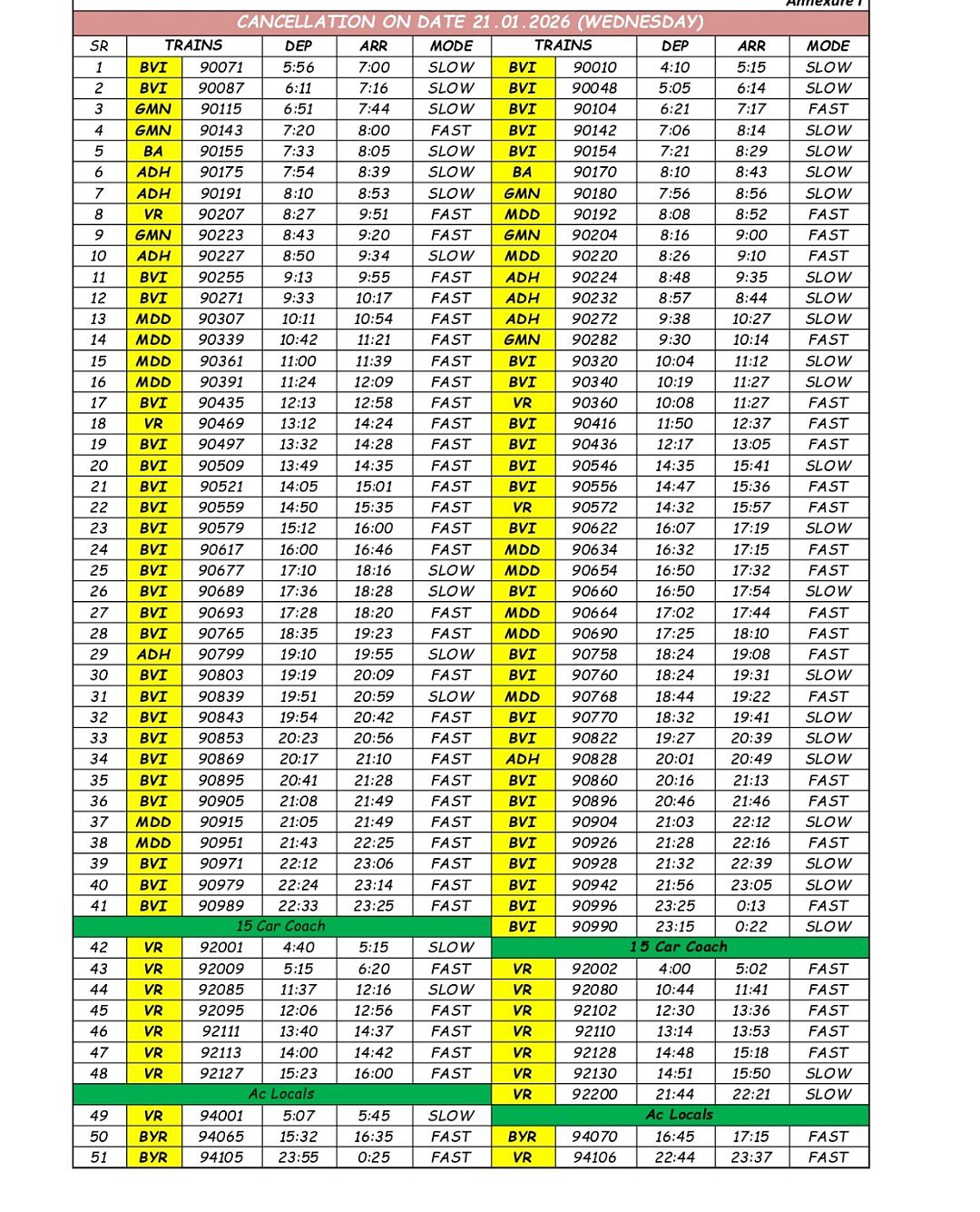 Due to suspension of exit & entry at Kandivali car shed and speed restrictions imposed on UP & Down fast line between Kandivali and Malad several suburban services will remain cancelled on 21th January, 2026.