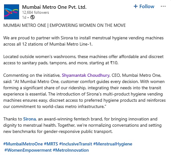 In a post on Mumbai Metro One's official handle on LinkedIn, it said, "We're normalising conversations and setting new benchmarks for gender-responsive public transport."