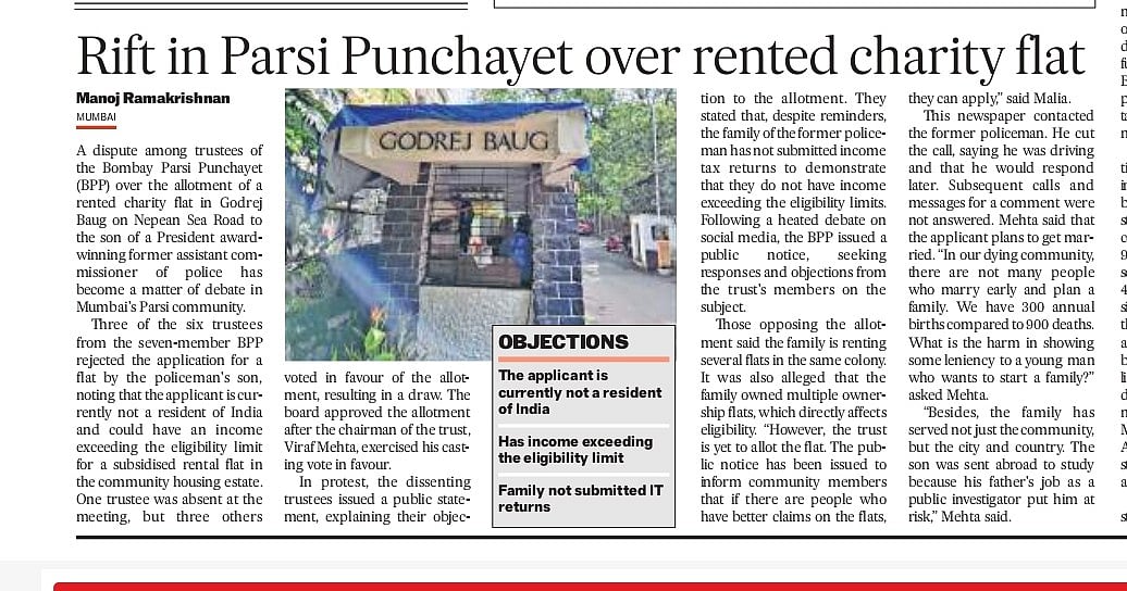 The BPP, one of the biggest land owners in the city, with over 5000 charity flats in colonies called baugs across the city, was accused of favouritism by voting to allot a flat in Godrej Baug, Nepean Sea Road, to the family of the former policeman though they did not fulfill certain criteria for community housing. The flats in the BPP colonies are alloted to Parsis with income below a certain threshold.