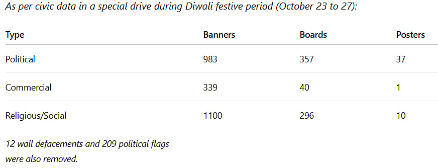 However, a senior civic official said, “Our ward-level teams keep vigil and remove every illegal hoarding that appears. Unfortunately, new political banners and hoardings often go up overnight. We have instructed printers to obtain civic permission before producing advertisements for municipal roads or footpaths and have urged political parties to ensure their workers follow the rules. The idea of designated zones for political hoardings has also been discussed, but implementing it requires political will.”