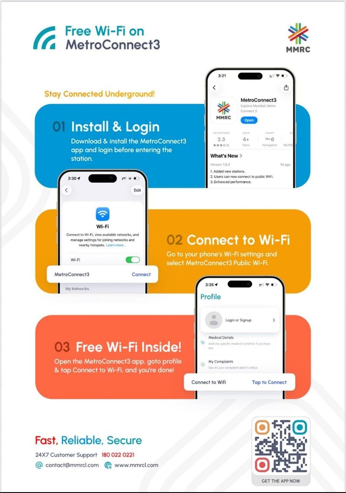 Mumbai Metro Rail Corporation (MMRC) has introduced free Wi-Fi connectivity at all Mumbai Metro Line 3 stations to enhance passenger convenience and support digital ticket booking . Currently passengers are struggling for mobile network in the final phase of Metro line 3.