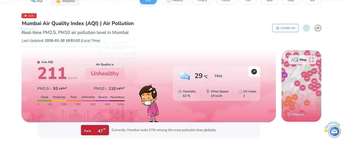 According to data from AQI.in, at 5 pm on January 30, Mumbai’s overall AQI stood at 211, placing it in the ‘Unhealthy’ category. Delhi, meanwhile, recorded an overall AQI of 185, categorised as ‘Poor’, a level below Mumbai on the air quality scale.