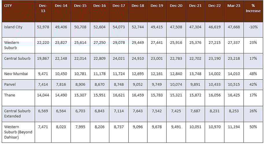 The average price of Mumbai Metropolitan Region in 2013 was 18,845 per sq. ft, which after 10 years stands at 18,708 per sq. ft, a decline of 1%, the study says.