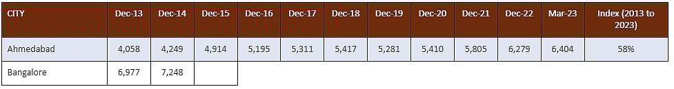 During the same 10 year period, the property prices in Hyderabad have almost doubled with 98% appreciation, followed by NCR, where the average price grew 63%, Ahmedabad 58%, Bengaluru 38%, Chennai 35%, Kolkata 37% and Pune 20%, the report says.