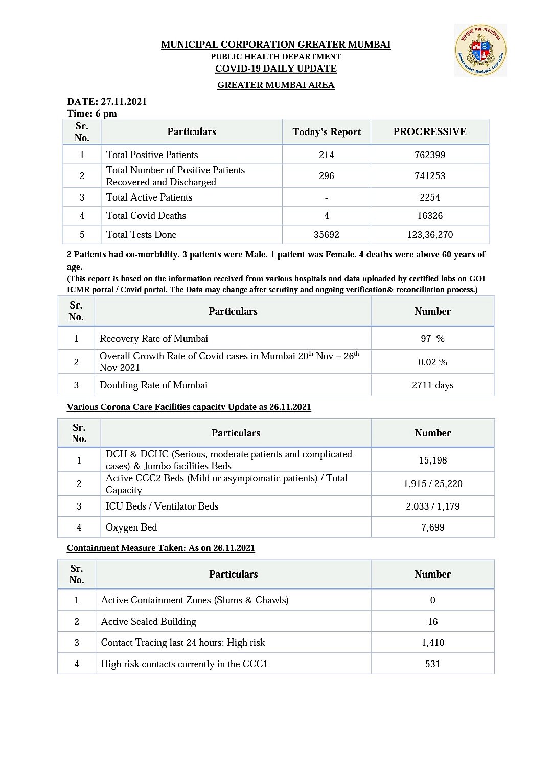 Mumbai reported 214 new COVID-19 cases on November 27, Saturday, taking the total tally to 7,62,399.
