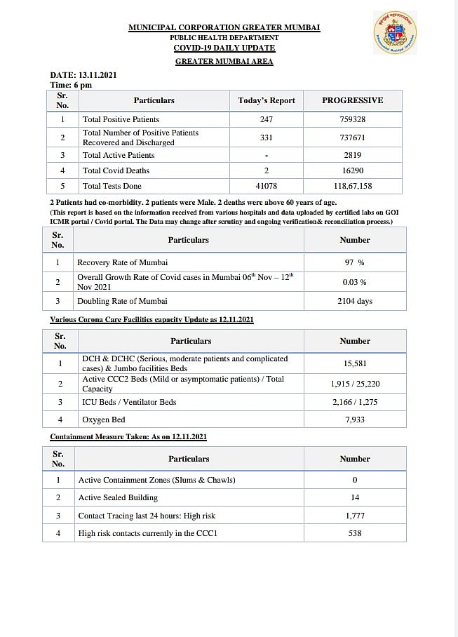 Mumbai reported 247 new COVID-19 cases on November 13, Saturday, taking the total tally to 7,59,328.