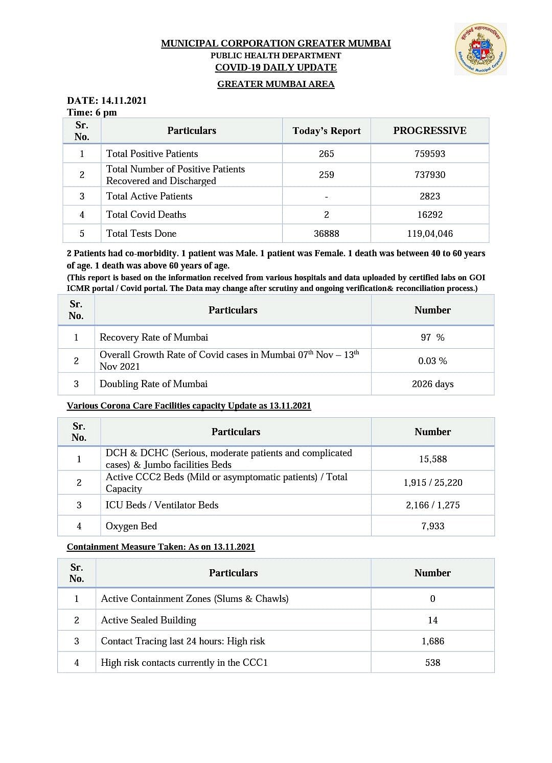 Mumbai reported 265 new COVID-19 cases on November 14, Sunday, taking the total tally to 7,59,3593.