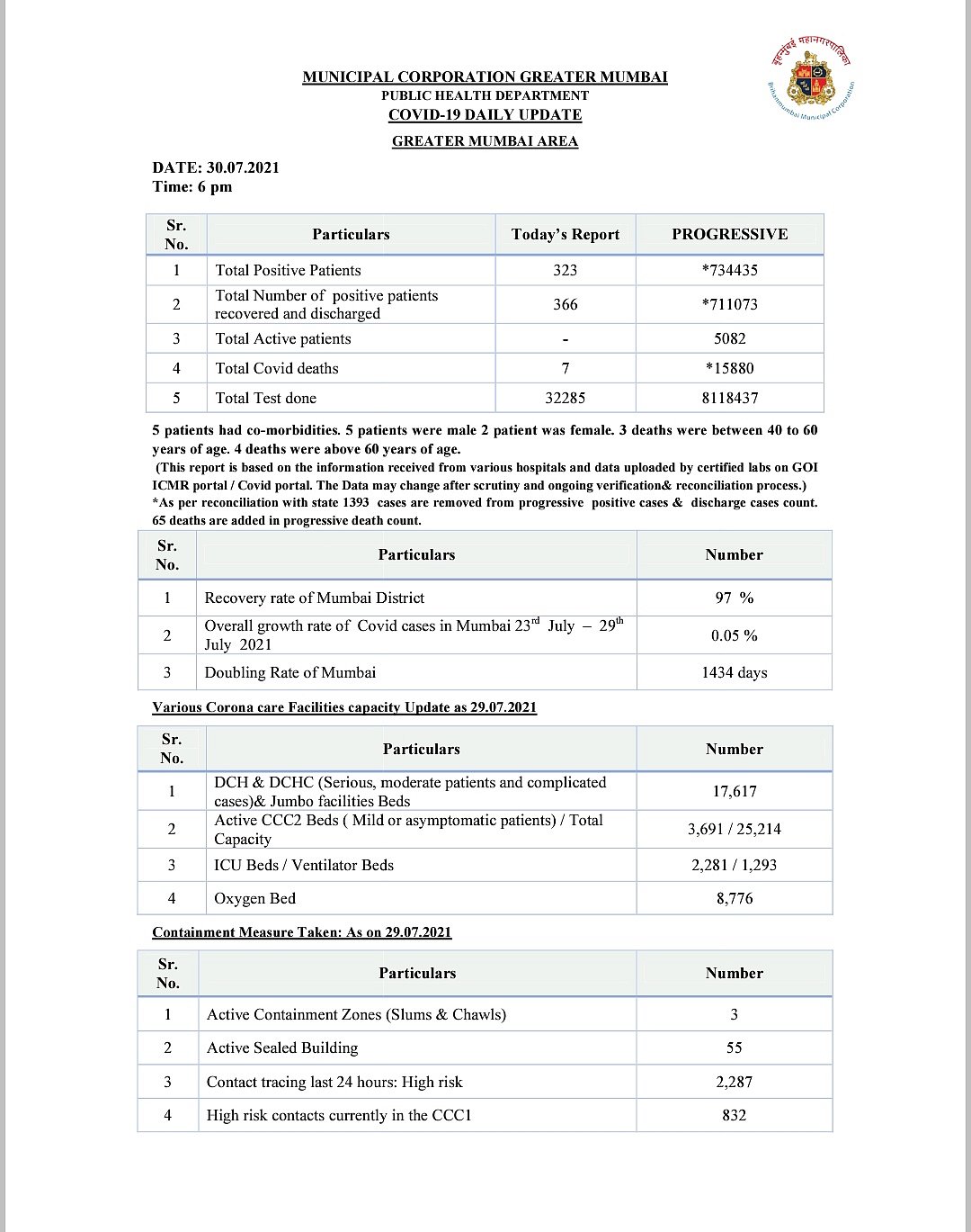 There are total 3 containment zones in the city and 55 buildings have been sealed as per today's data. Recovery rate of Mumbai district has increased to 97 percent.