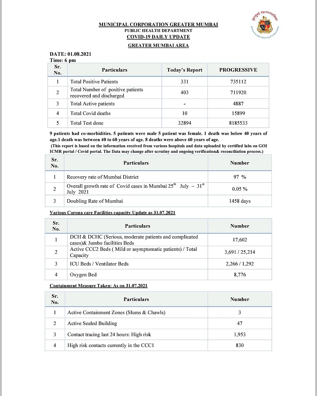 There are total 3 containment zones in the city and 47 buildings have been sealed as per today's data. Recovery rate of Mumbai district has increased to 97 percent.
