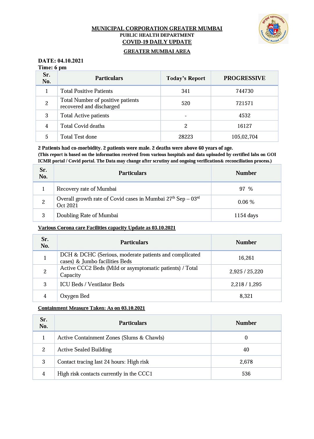 Mumbai reported 341 new COVID-19 cases on October 4, Monday, taking the total tally to 7,44,730.