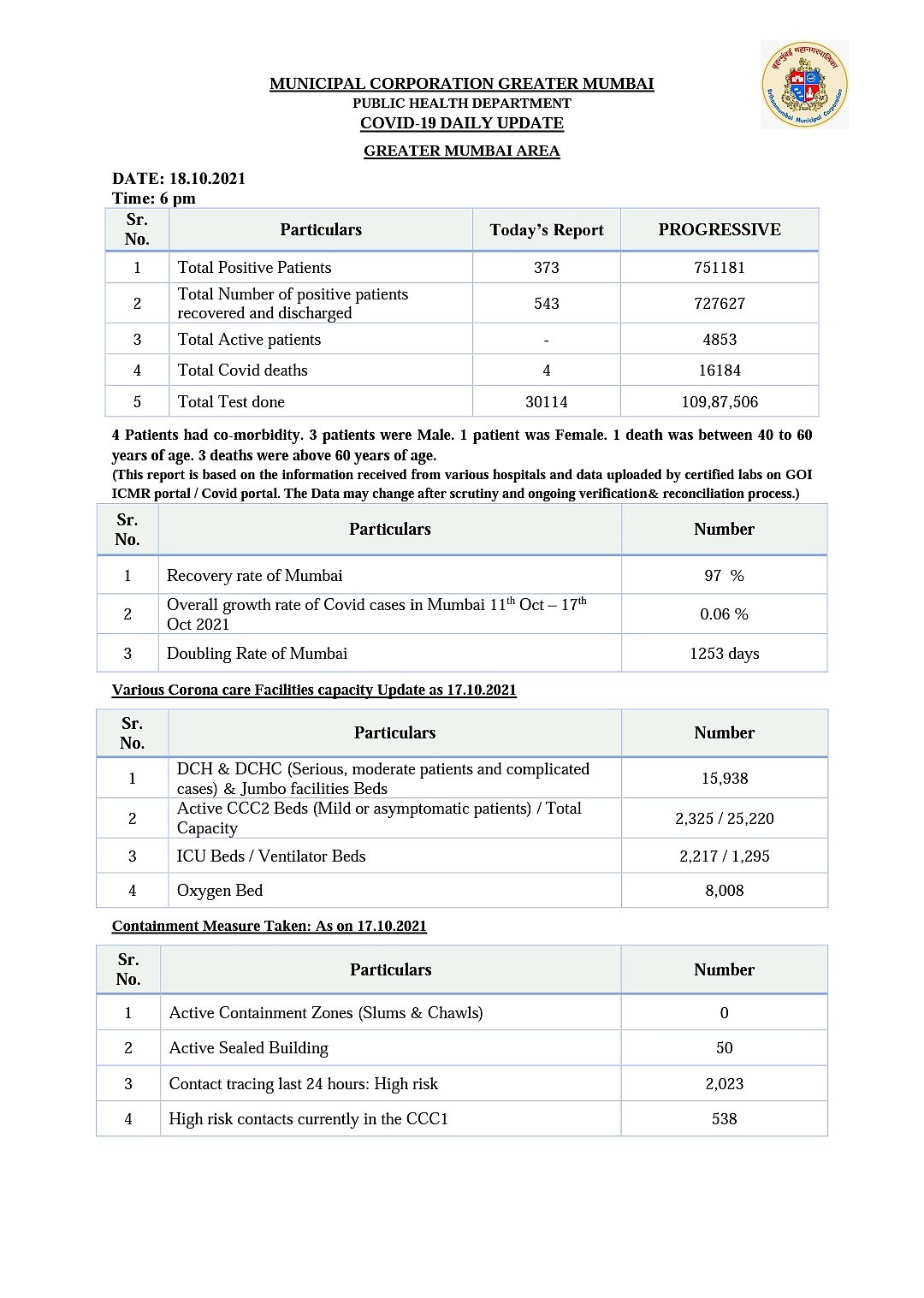 Mumbai reported 373 new COVID-19 cases on October 18, Monday, taking the total tally to 7,51,181.