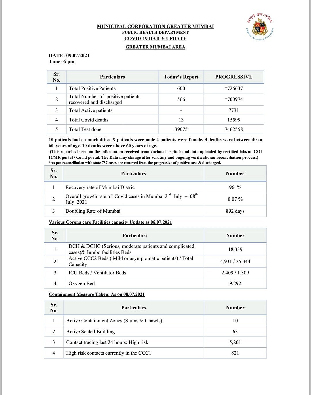 There are total 10 containment zones in the city and 63 buildings have been sealed as per today's data. Recovery rate of Mumbai district has increased to 96 percent.