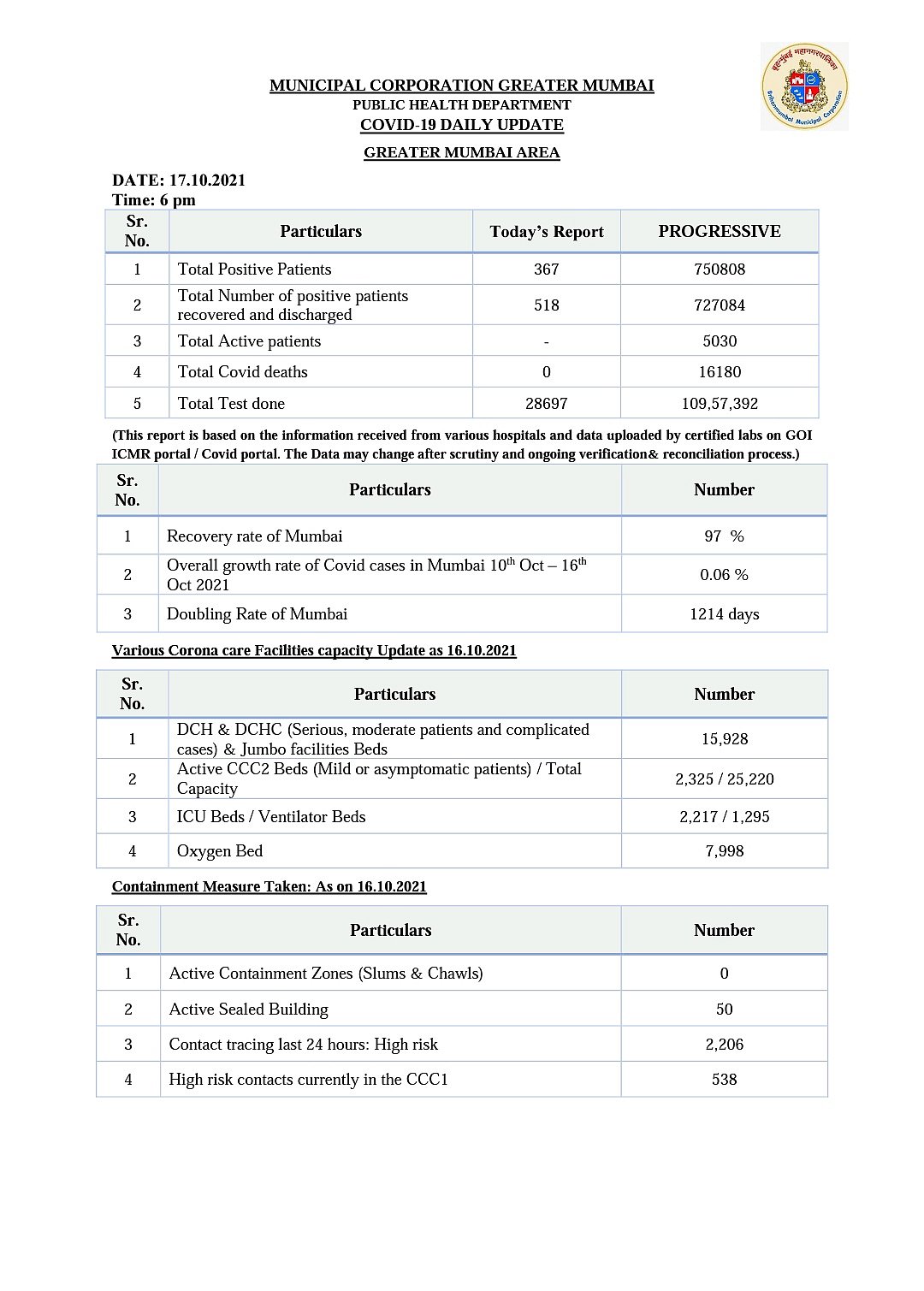 There are total 0 containment zones in the city and 50 buildings have been sealed as per today's data. Recovery rate of Mumbai district has increased to 97 percent.