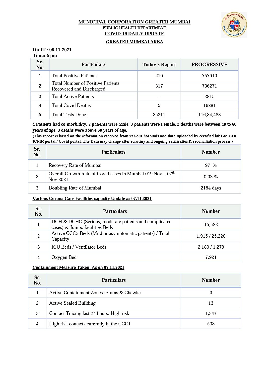 There are total 0 containment zones in the city and 13 buildings have been sealed as per today's data. Recovery rate of Mumbai district has increased to 97 percent.