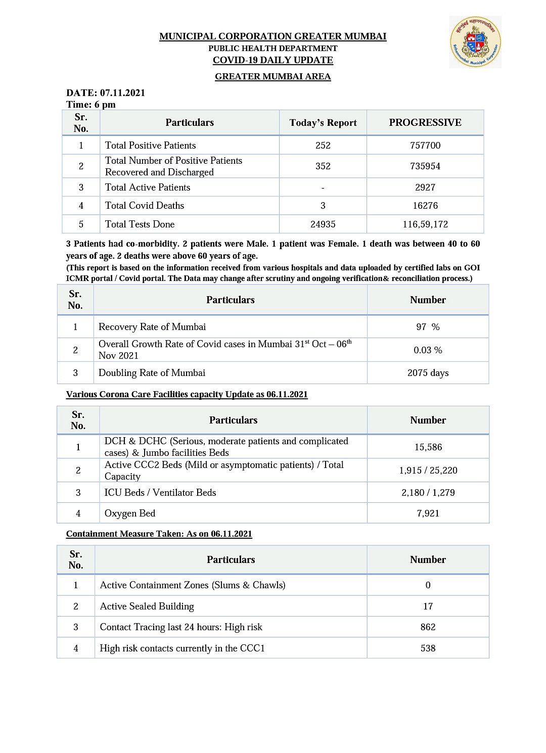 Mumbai reported 252 new COVID-19 cases on November 7, Sunday, taking the total tally to 7,57,700.