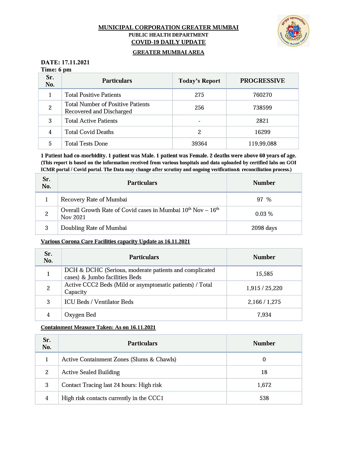 There are total 0 containment zones in the city and 18 buildings have been sealed as per today's data. Recovery rate of Mumbai district has retained at 97 percent.