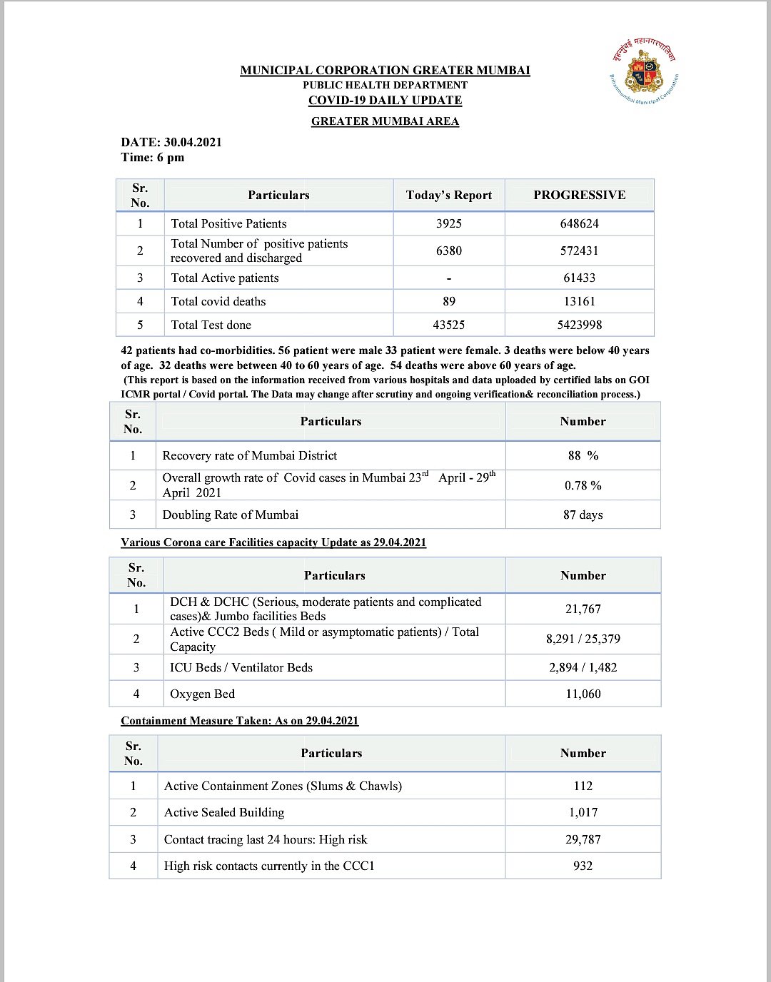 According to the BMC, the city's average growth rate of COVID-19 for the period between April 23 and 29 is 0.78 per cent, while the case doubling rate is 87 days.