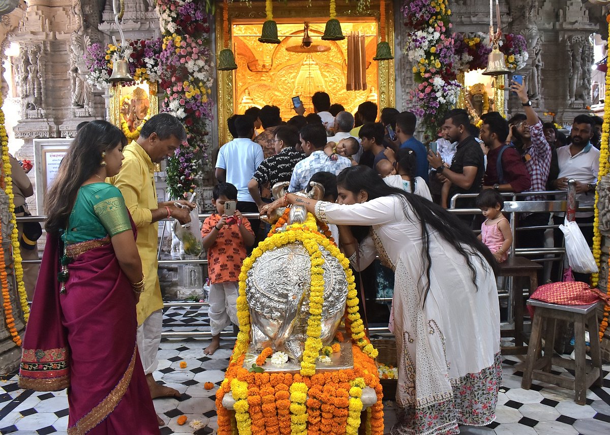 Devotees offer prayers to the Shiva linga at Babulnath Temple |