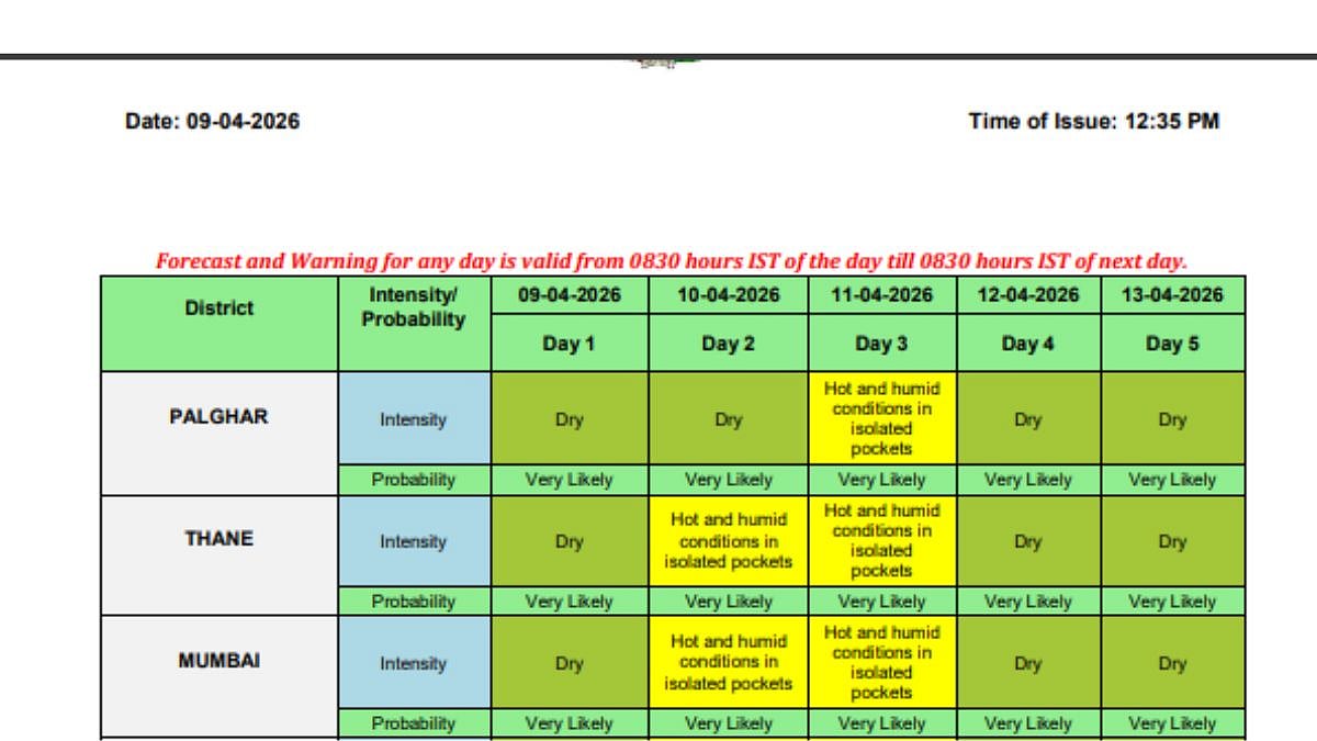 According to the Regional Meteorological Centre, a yellow alert for hot and humid conditions is very likely to prevail in Mumbai, Thane, and Palghar on April 10 and 11.