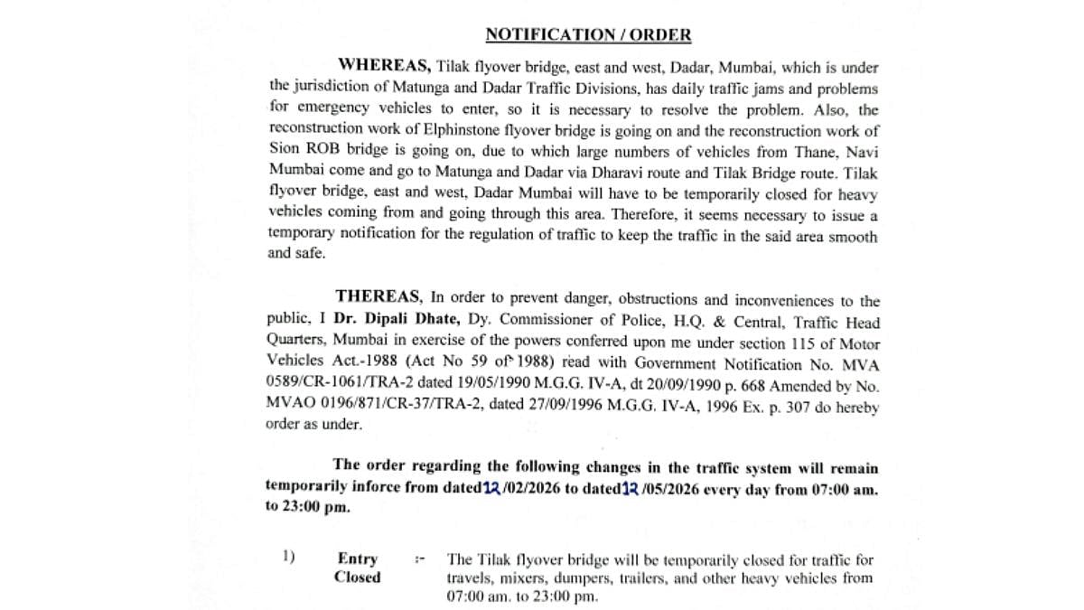 Mumbai: The Mumbai Traffic Police announced temporary closure of Dadar's Tilak Bridge for heavy vehicles from today, February 12, citing traffic congestion and difficulties faced by emergency vehicles. In an official notification by the Mumbai Traffic Police, the restriction comes as reconstruction of the Elphinstone flyover and Sion ROB has diverted Thane and Navi Mumbai traffic come and go to Matunga and Dadar via the Dharavi route and Tilak Bridge route, leading to severe congestion.