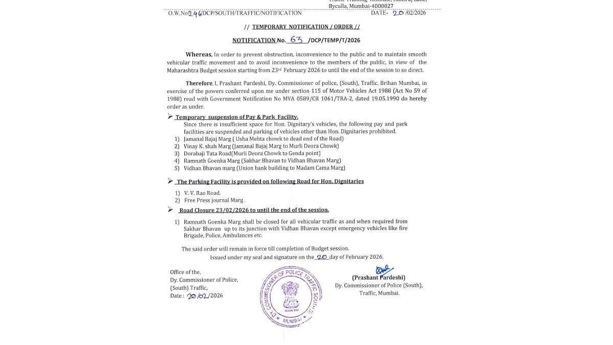 Mumbai: As the Maharashtra Budget Session commences from February 23, the Mumbai Traffic Police have announced temporary traffic restrictions in South Mumbai around Vidhan Bhavan to ensure smooth vehicular movement and prevent inconvenience to the public. The budget session of the Maharashtra legislature will be held from February 23 to March 25, with Chief Minister Devendra Fadnavis scheduled to present the budget for 2026-27 on March 6.