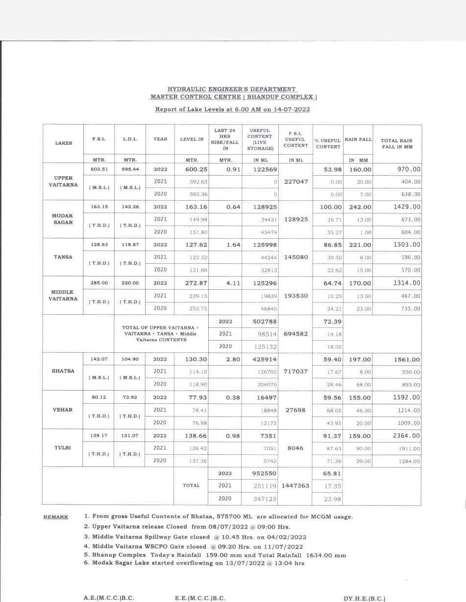 Speaking categorically, Tansa dam in Thane district has 86.85 per cent useful water content, while the Bhatsa dam has 59.40 per cent useful water content. Middle Vaitarna has 67.74 per cent useful water content.
