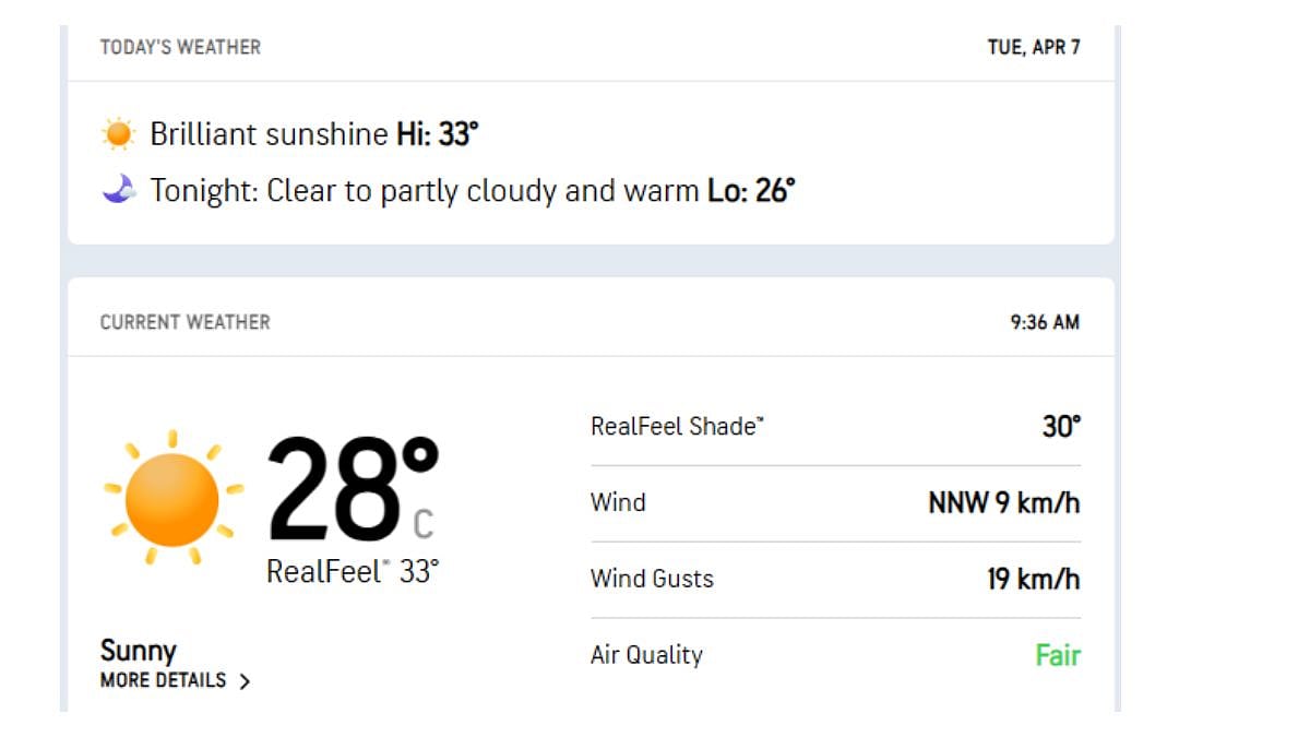 According to AccuWeather, the early-morning temperature was 28°C, with sunny and warm weather predicted for today. Temperatures are likely to range between 28°C and 33°C. While no heatwave warning has been issued, warm conditions will prevail, with clear to partly cloudy skies expected at night. According to RMC Mumbai, the weather is very likely to remain dry in Mumbai, Thane, and Palghar until April 9.