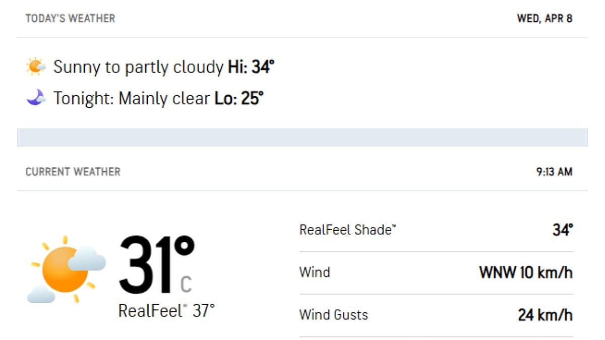 According to AccuWeather, the morning temperature settled at 31°C at 9 am, with sunny and partly cloudy weather predicted for today. Temperatures are likely to range between 25°C and 34°C. While no heatwave warning has been issued, warm conditions will prevail. According to RMC Mumbai, the weather is very likely to remain dry in Mumbai, Thane, and Palghar until April 9.