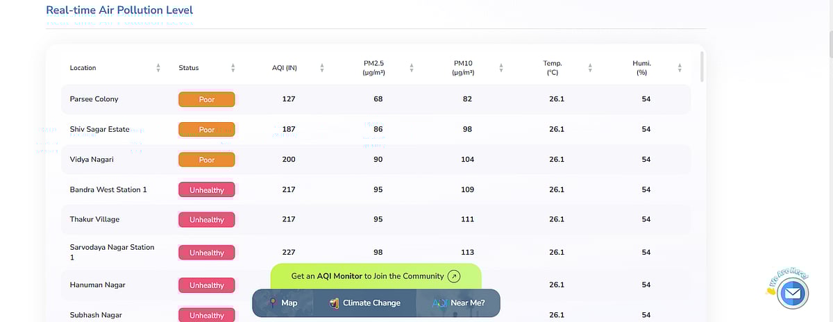In contrast, limited pockets reported significantly better air quality. Parsee Colony recorded an AQI of 127, categorised as ‘Poor’. Shiv Sagar Estate, Vidhya Nagar, Bandra West Station and Thakur Village recorded AQI readings of 187 (Poor), 200 (Poor), 217 (Unhealthy) and 217 (Unhealthy), respectively.
