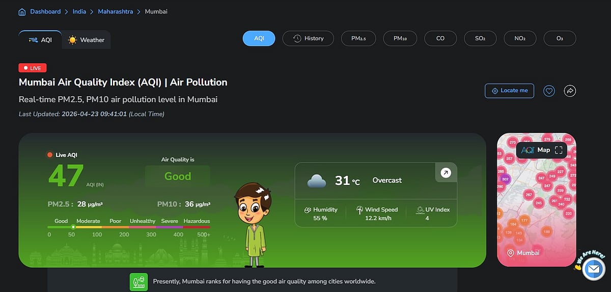 Air quality data showed Mumbai’s overall Air Quality Index (AQI) at 47 in the early hours, placing it in the ‘good’ category. This continues a trend seen over the past few weeks, with the city recording good to moderate air quality levels.