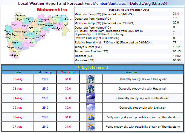 The IMD forecasts cloudy skies with moderate to heavy rain showers for the next week. From Saturday to Tuesday, cloudy skies will dominate, and the city will continue to experience rains as the monsoon reduces in Mumbai and the Mumbai Metropolitan Region (MMR).