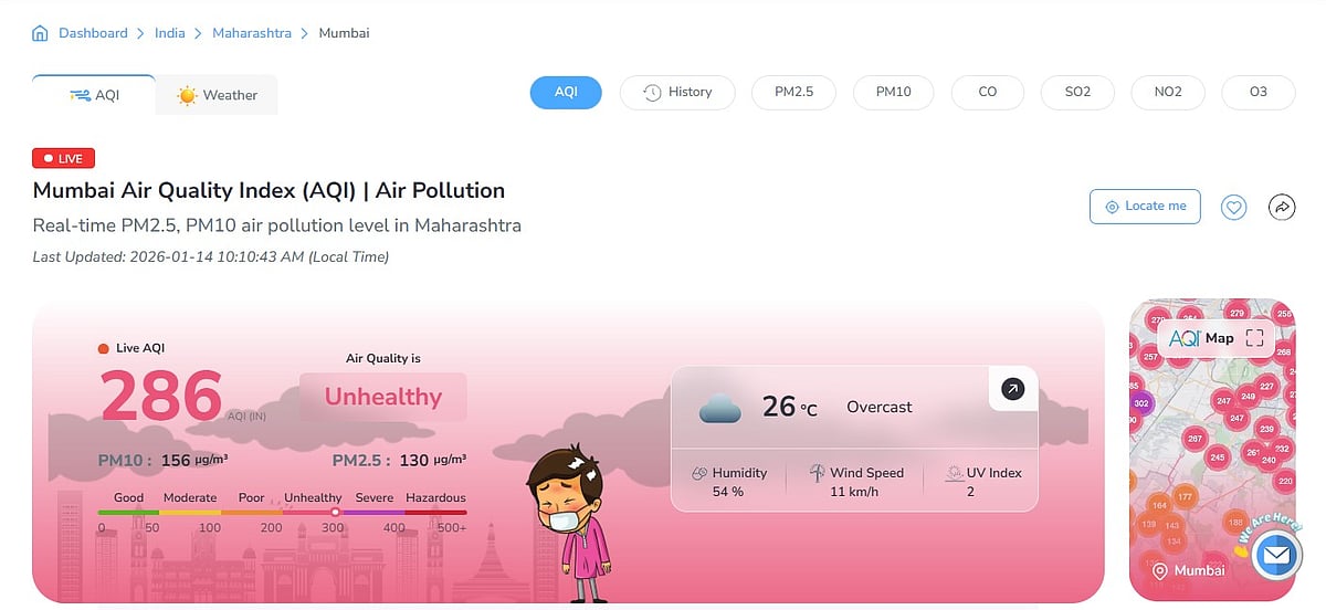 According to data from air quality monitoring platform AQI.in, Mumbai’s overall Air Quality Index (AQI) touched 286 during the early hours, placing it firmly in the ‘unhealthy’ category. Health experts warned that such pollution levels can pose serious risks, particularly to children, senior citizens and individuals suffering from respiratory or heart-related ailments. Residents were advised to avoid prolonged outdoor exposure and limit physical activity outdoors.