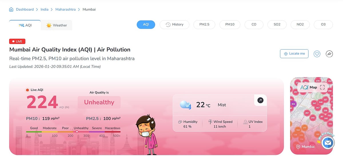 According to data from AQI.in, Mumbai’s overall Air Quality Index (AQI) reached 224, placing it in the ‘unhealthy’ category. Such levels can be harmful, especially for children, senior citizens and people suffering from respiratory or heart-related ailments. Citizens were advised to limit prolonged outdoor exposure.
