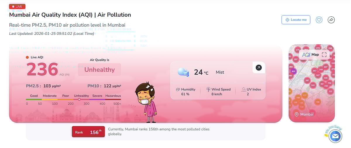 Mumbai: Mumbai woke up to yet another cool, cloudy Sunday morning with moderate temperatures on the 25th of January 2026. Yet, this experience was short-lived as pollutants continue to hover over the city. The city has observed an increase in the overall Air Quality Level (AQI) in a single day, moving from 149 (Poor) the previous day to 236 (Unhealthy) today.