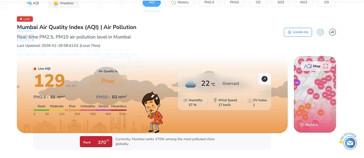 Mumbai’s air quality showed a notable improvement after remaining in the ‘severe’ category for several consecutive days. As per data from AQI.in, the city’s overall Air Quality Index stood at 129 on Wednesday morning, placing it in the ‘poor’ category. While still above the safe limit, the reading marks a substantial recovery from last week, when AQI levels had crossed the 300 mark in several parts of the city.