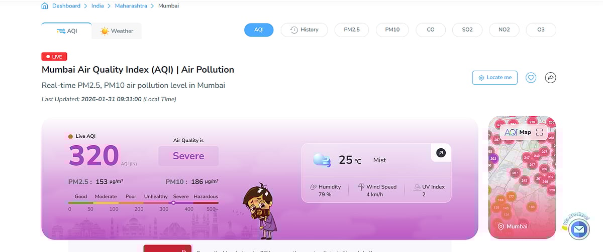 As per data from AQI.in, Mumbai’s overall Air Quality Index (AQI) currently stands at 320, placing it firmly in the ‘severe’ category. This marks a rise from Friday’s reading of 304. Notably, air quality had shown temporary improvement on Friday evening, dipping to 199 (‘poor’) around 5.30 pm, before deteriorating sharply overnight and crossing the 300 mark again, making the air unsafe even for healthy individuals.
