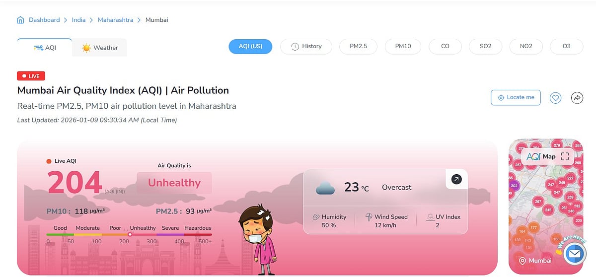 Data from air quality monitoring platform AQI.in showed that Mumbai’s overall Air Quality Index (AQI) touched 204 in the early hours, placing it in the ‘unhealthy’ category. Health experts cautioned that prolonged exposure to such pollution levels can have serious health consequences, particularly for children, senior citizens and individuals with respiratory or cardiac conditions. Residents were advised to minimise outdoor activities and avoid prolonged exposure to polluted air.