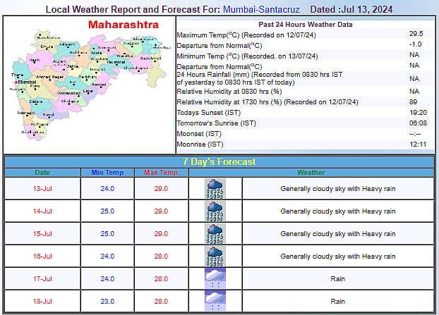 Cloudy skies and moderate to heavy rains are forecast for the upcoming week in Mumbai. Heavy rains and thundershowers have lashed the city in the past couple of weeks. Due to the continuous rains, temperatures have notably decreased, and the Air Quality Index (AQI) has improved, falling within the 'good' and 'satisfactory' categories.