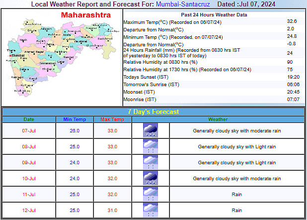 Light to moderate rains with occasional thunderstorms are predicted for Mumbai and the Mumbai Metropolitan Region (MMR) over the next week. The arrival of sufficient rains has led to a notable drop in the city's temperature following a very hot and humid summer.
