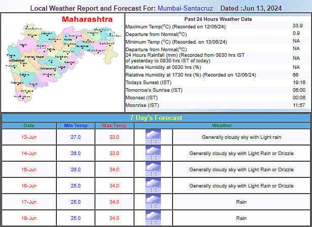 From Sunday through Tuesday of the following week, temperatures are expected to further decrease to around 25 degrees Celsius. Maximum temperatures are expected to remain around 33-34 degrees Celsius. The monsoon is likely to bring sustained rain showers, leading to a notable drop in temperatures by 4-5 degrees Celsius.