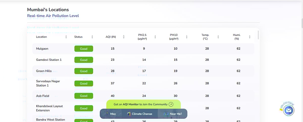 Even at a regional level, several areas reported good air quality. Mulgaon recorded the lowest AQI at 15, falling in the ‘good’ category. Other areas such as Gamdevi Station 1 (23), Green Hills (28), Sarvodaya Nagar Station 1 (37), ABS Field (40) also reported ‘good’ air quality levels.