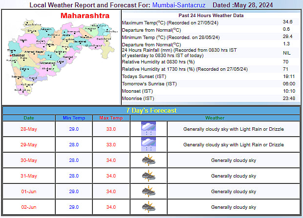 Light rain showers and cloudy sky conditions are predicted to persist throughout the week as the monsoon is nearing to enter the mega city soon. According to an IMD report, the monsoon will enter Mumbai by June 10-11. However, the city's humidity will remain high until good amount of rains greet the city.