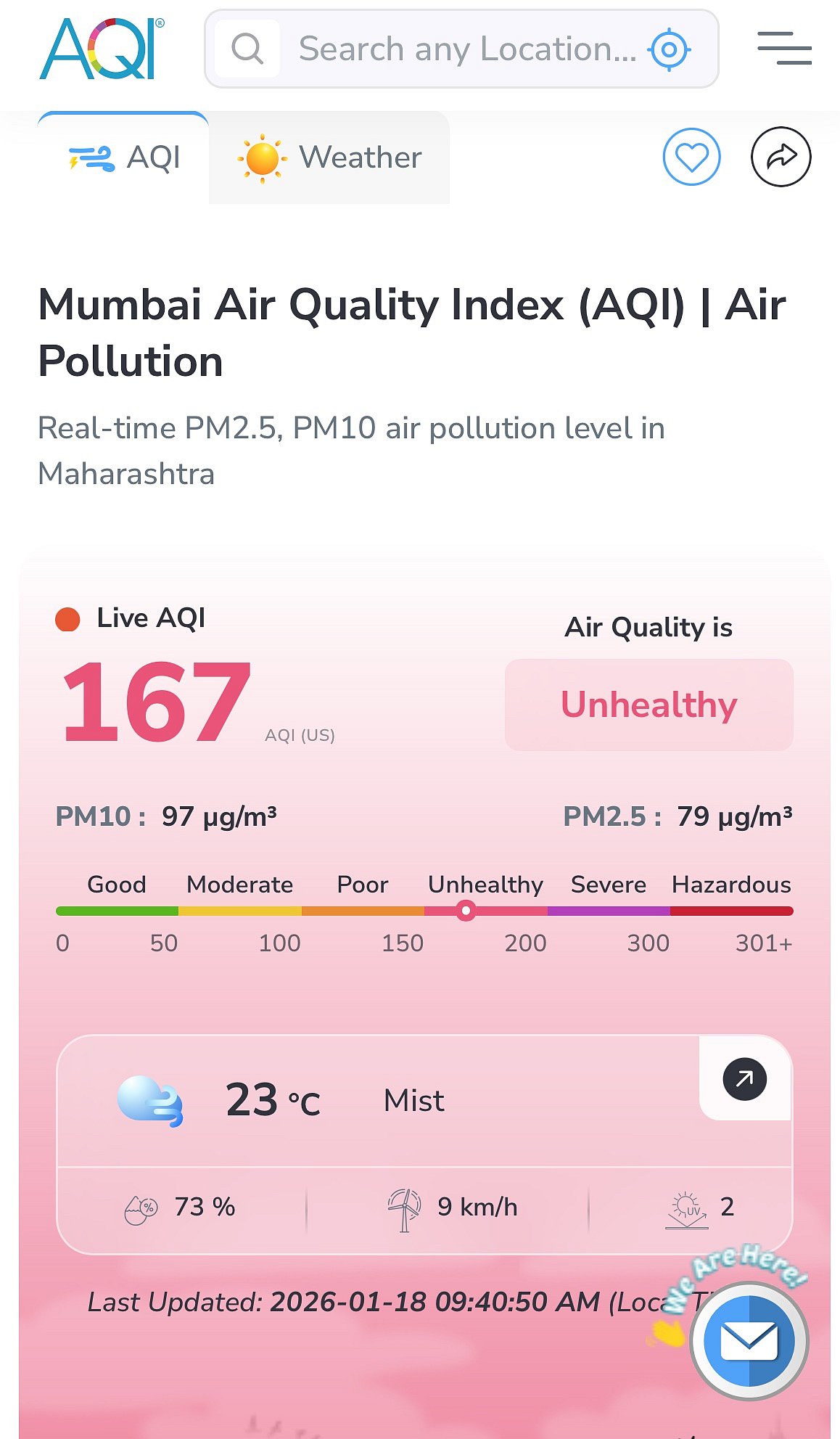 Mumbai woke up to bright sunshine and comfortable winter temperatures on Saturday, but behind the pleasant weather, the city continued to battle worrying levels of air pollution. Real time data from air quality monitoring platforms showed Mumbai’s Air Quality Index in the unhealthy category, raising concerns for public health despite the calm and seemingly fresh morning.