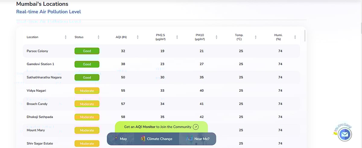 In contrast, several neighbourhoods reported relatively cleaner air. Parsee Colony recorded an AQI of 32, among the lowest in the city. Gamdevi Station 1 reported 38 (‘Good’), while Sathathharatha Nagara stood at 50 (‘Good’). Vidya Nagar (55) and Breach Candy (57) were placed in the ‘Moderate’ category.