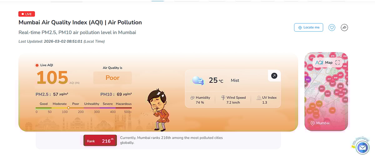 Mumbai: Mumbai woke up to clear skies and a warm Monday morning on March 2, 2026, even as air quality levels continued to remain in the ‘Poor’ category. A thin layer of haze was visible across parts of the skyline, slightly affecting visibility for early morning commuters.
